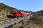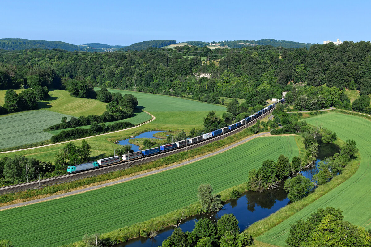 Ein Motiv, welches sich nur im Hochsommer am frühen Morgen mit Seitenausleuchtung der Züge umsetzten läßt, ist der Blick auf das Altmühl-Altwasser und das Portal des Esslinger Tunnels bei Hagenacker. Am 10. Juni 2023 konnte ich an dieser Stelle die Durchfahrt von 185 576 mit dem DGS 43821 von Bremen Grolland nach Verona Q.E. dokumentieren. Die für Lokomotion fahrende Traxx wird den ausschließlich mit Aufliegern der Speditionen paneuropa und Terratrans beladenen KLV-Zug bis München Ost Rbf befördern.