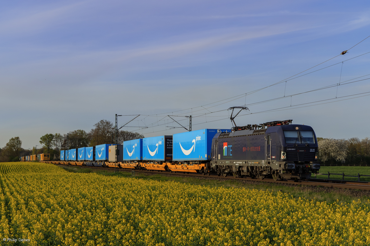 193 329 war mit einem "KLV" am 6. April 2024 bei Vierkirchen auf dem Weg nach München.