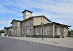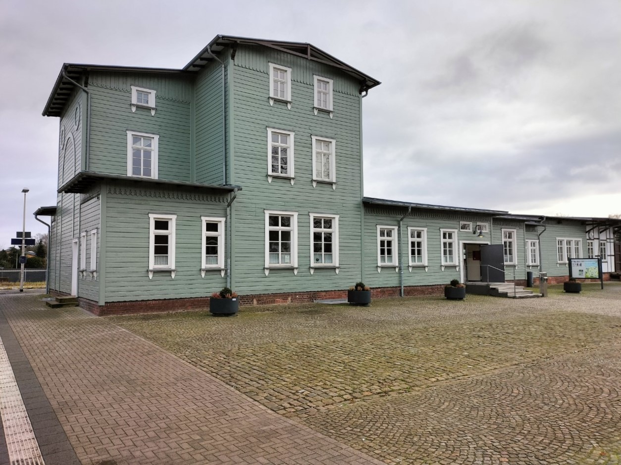 Die besten Zeiten hat der Bahnhof Jessen hinter sich. Das Empfangsgebäude steht leer und das Grünzeug wuchert.