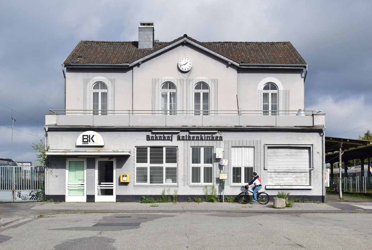 Blick auf das 1930 bis 1931 errichtete Empfangsgebäude Gelsenkirchen Schalke Nord. Der Personenverkehr auf diesem Streckenabschnitt wurde am 26.5.1974 eingestellt. Zuletzt war hier ein Immobilienmakler eingezogen. Mitlerweile steht das Gebäude seit einiger Zeit leer und verrammelt.