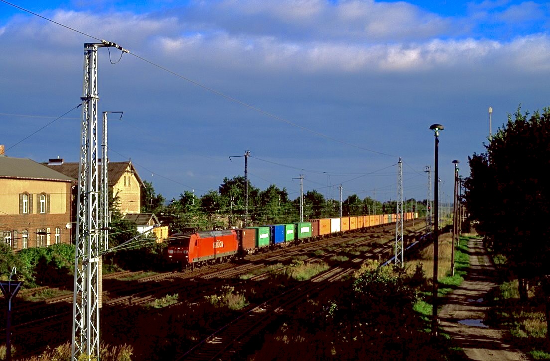 298 310-4 der  DB Cargo AG (NVR: 98 80 3298 310-4 D-DB) und einem Güterzug Niederbordwagen Richtung Berlin am 02. Oktober 2025 in Diedersdorf auf den südlichen Berliner Außenring.