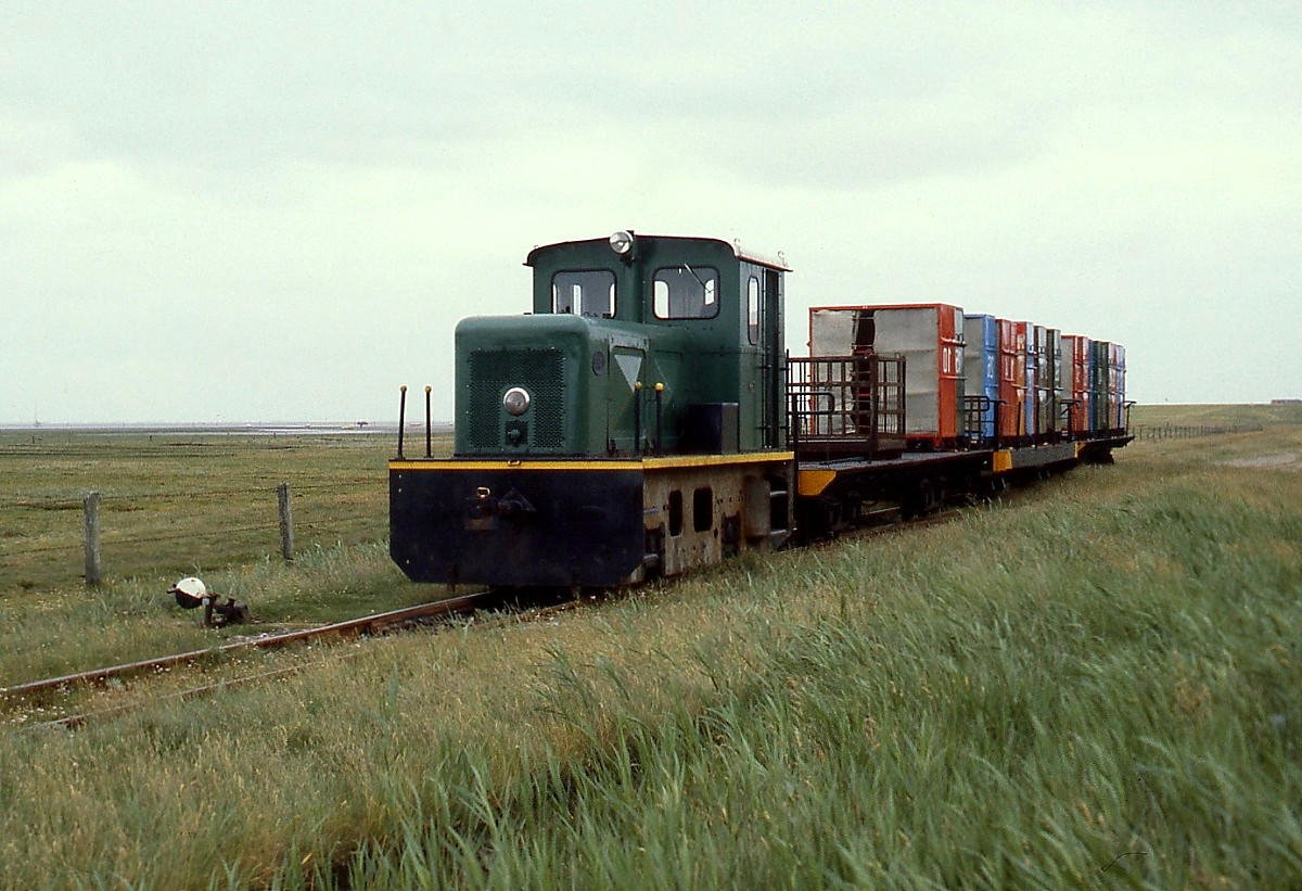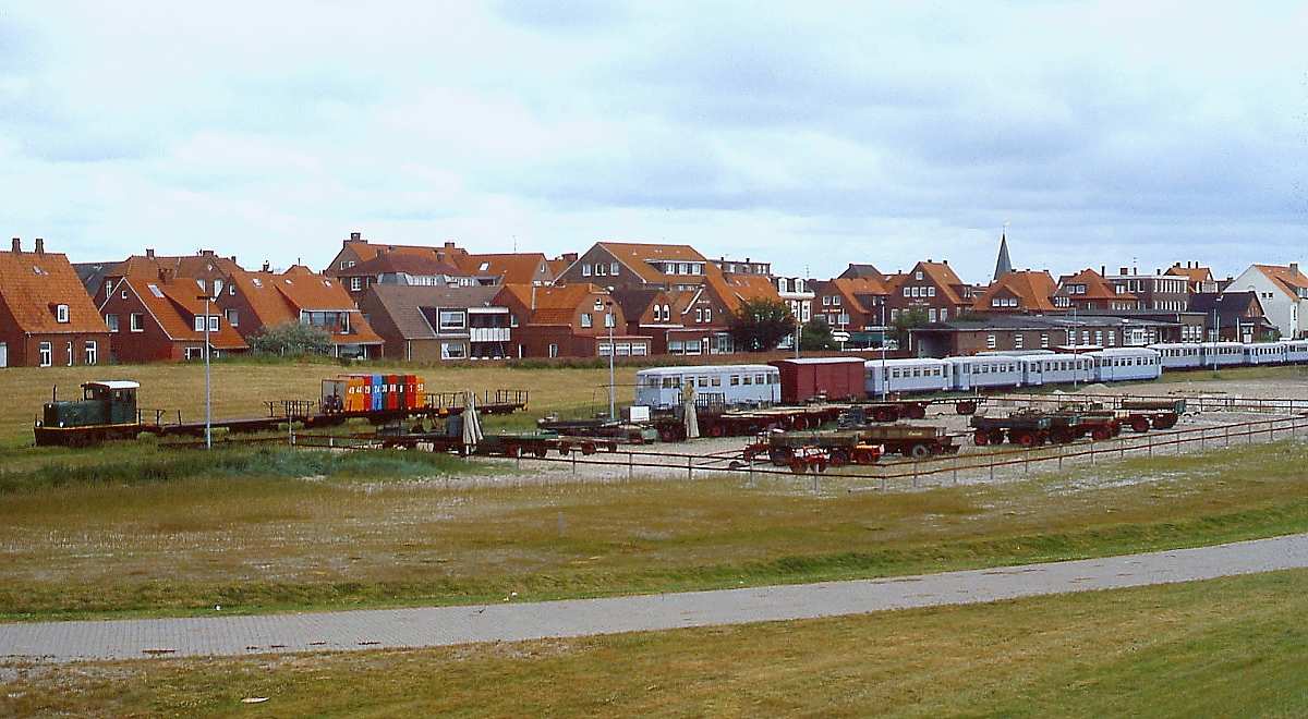 Blick von der ablegenden Fähre auf den Anleger der Juister Inselbahn im Mai 1981. Neben einem Personenzug ist rechts auch die Lok "Karl" zu sehen. Wegen der Strömungsverhältnisse lag der Anleger weit im Wattenmeer und führte über eine rund 600 m lange Pfahlbaustrecke durch das Watt auf die im Hintergrund sichtbare Insel.
