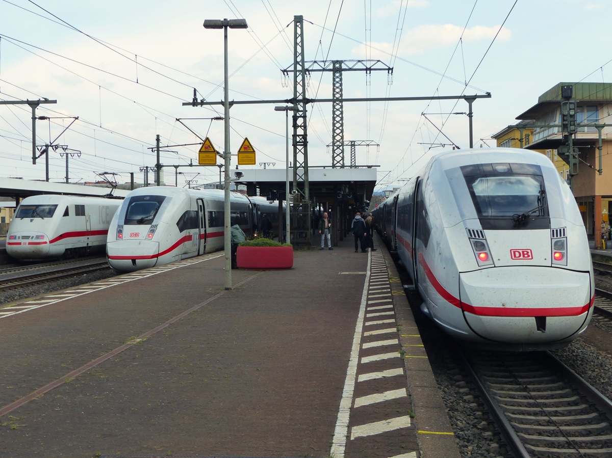 ICE Generationen am 13.12.2025 in Erfurt Hbf. DB 411 008  Berlin  war mit einem weiteren 411 als Tfzf Richtung Leipzig unterwegs. DB 412 xxx verkehrte als ICE 705 (Berlin Hbf - München Hbf) und DB 401 069-0  Worms  als ICE 795 (Leipzig Hbf - Frankfurt (M) Flughafen Fernbf).