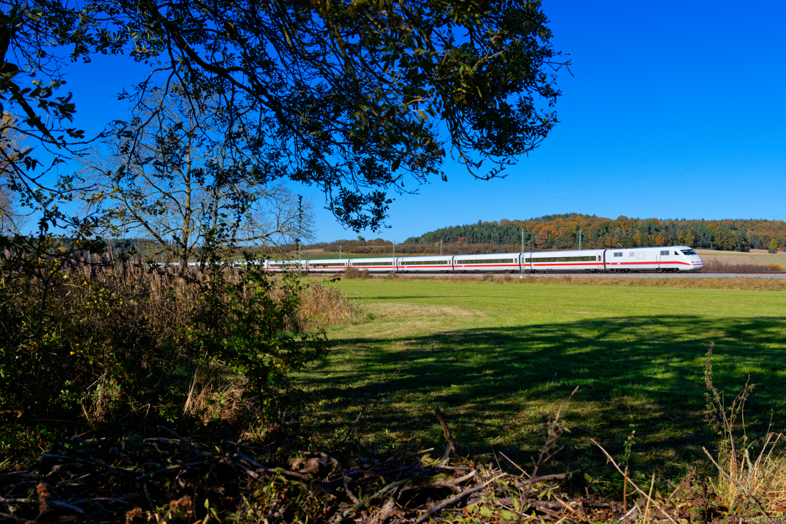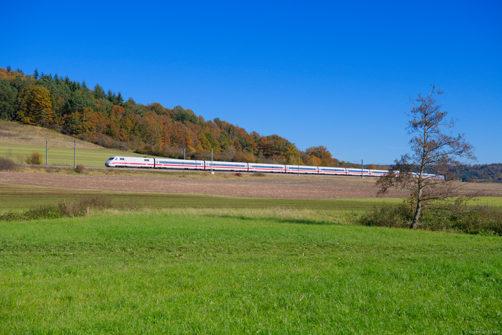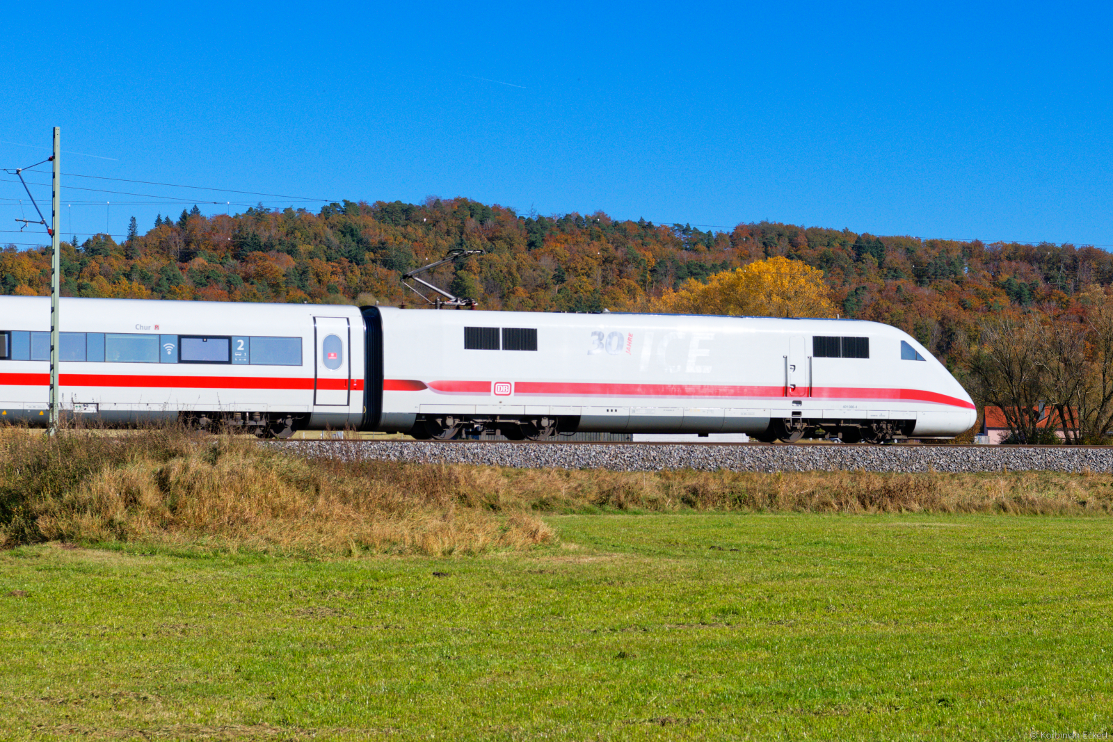 Zugbegegnung auf der Talbrücke Enzweihingen. Eine BR 401 Richtung Mannheim trifft als ICE 974 (Stuttgart-Kiel) auf den EC 117 (Frankfurt-Klagenfurt). Aufgenommen am 01.07.2013.