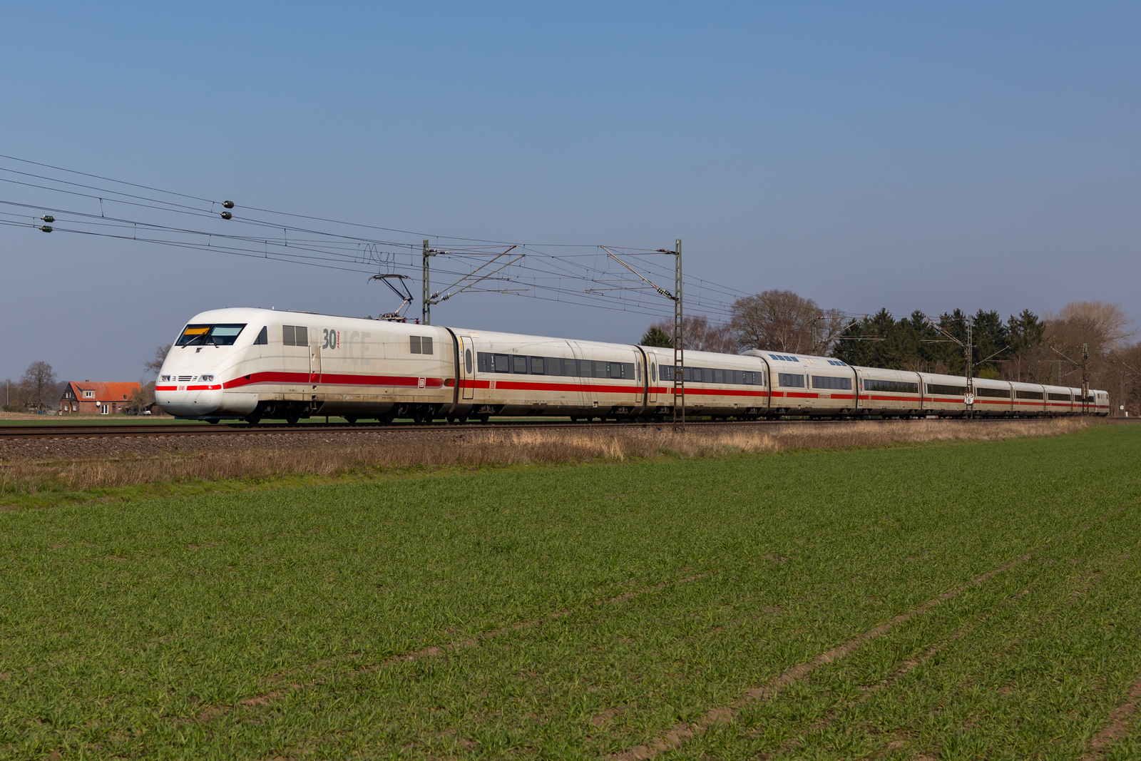 Der nicht über Hamburg fahrende ICE Binz-Saarbrücken,am 18 März 2026,gefahren vom 401 076,beim Halt,in Bergen/Rügen.
