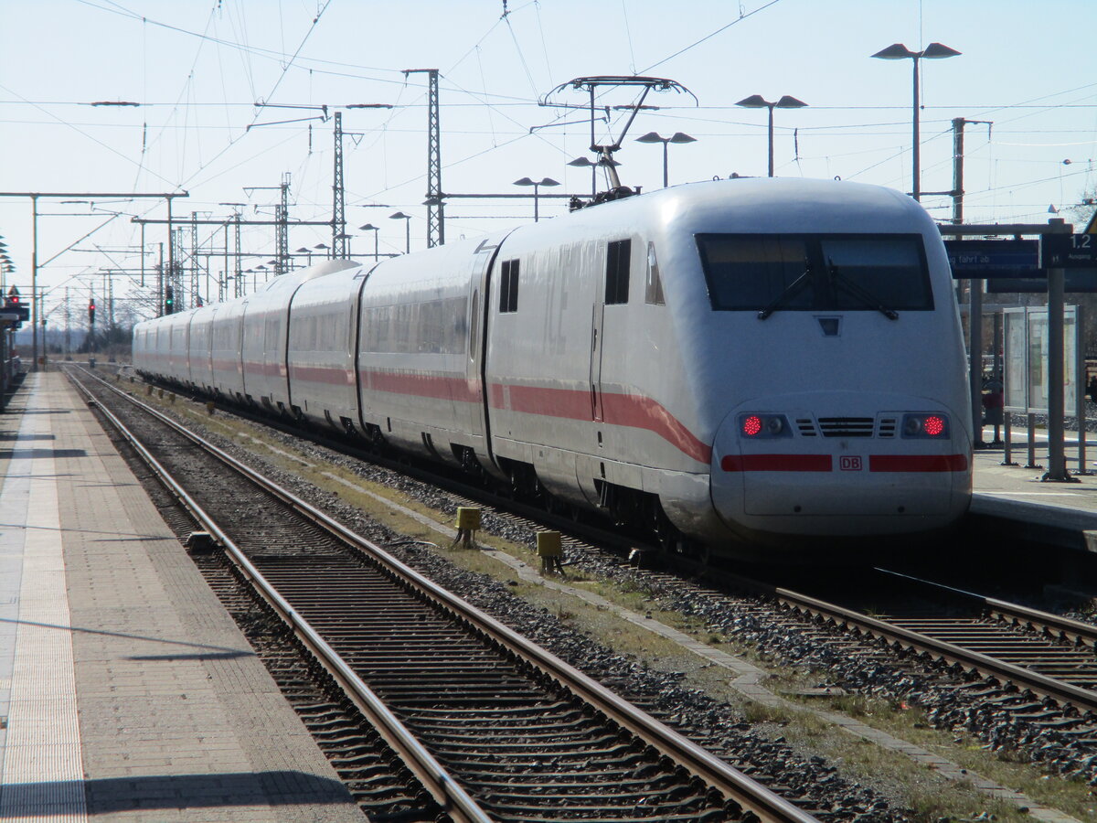 Begegnung eines IR Dosto nach Chur mit dem gerade ausfahrenden ICE nach Hamburg bei der Station Chur-Wiesental(man beachte die Spiegelung des ICE im IR Doppelstockzug)30.12.15