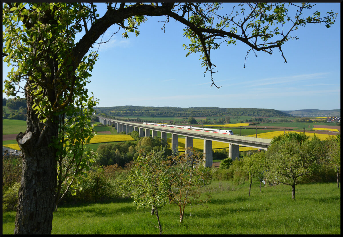 Ein ICE 1 in voller Länge ist durch die umfangreichen Bauvorhaben in Dresden auf die Güterzuggleise ausgewichen und gestattet im April 2026 den Einblick auf den gesamte Zug, solange der Unkrautbewuchs nicht weiter fortschreitet.