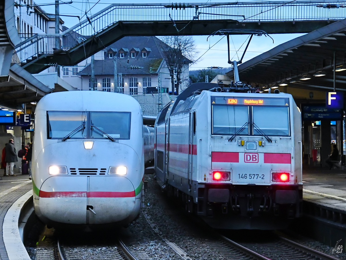 ICE2 (402 033-5) & IC2 (geschoben von 146 577-2) beim abendlichen Halt am Hauptbahnhof Wuppertal. (Februar 2021)