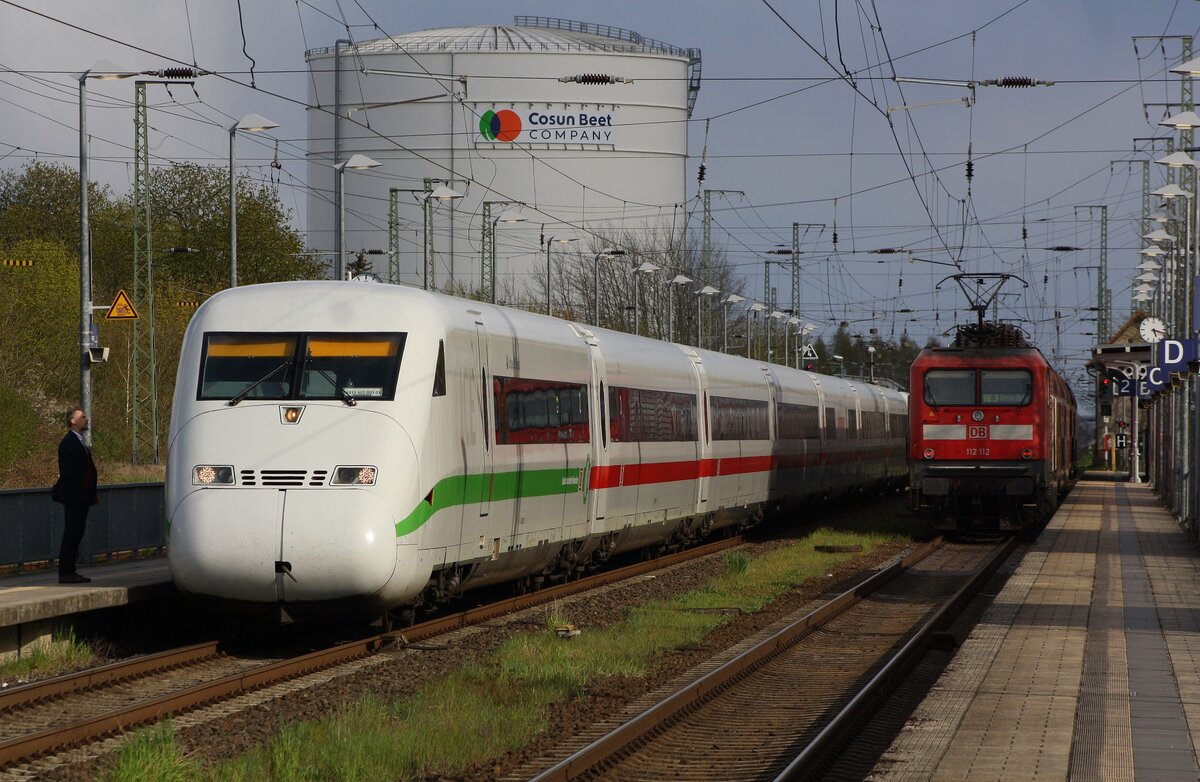 Wegen Hochwasserschäden an der Schnellfahrstrecke Berlin - Stendal - Wolfsburg wurde der Fernverkehr im Herbst 2013 über Magdeburg umgeleitet. Hier passiert der aus zwei ICE 2 gebildete ICE 546/556 am 19.10.2013 Magdeburg-Diesdorf.