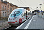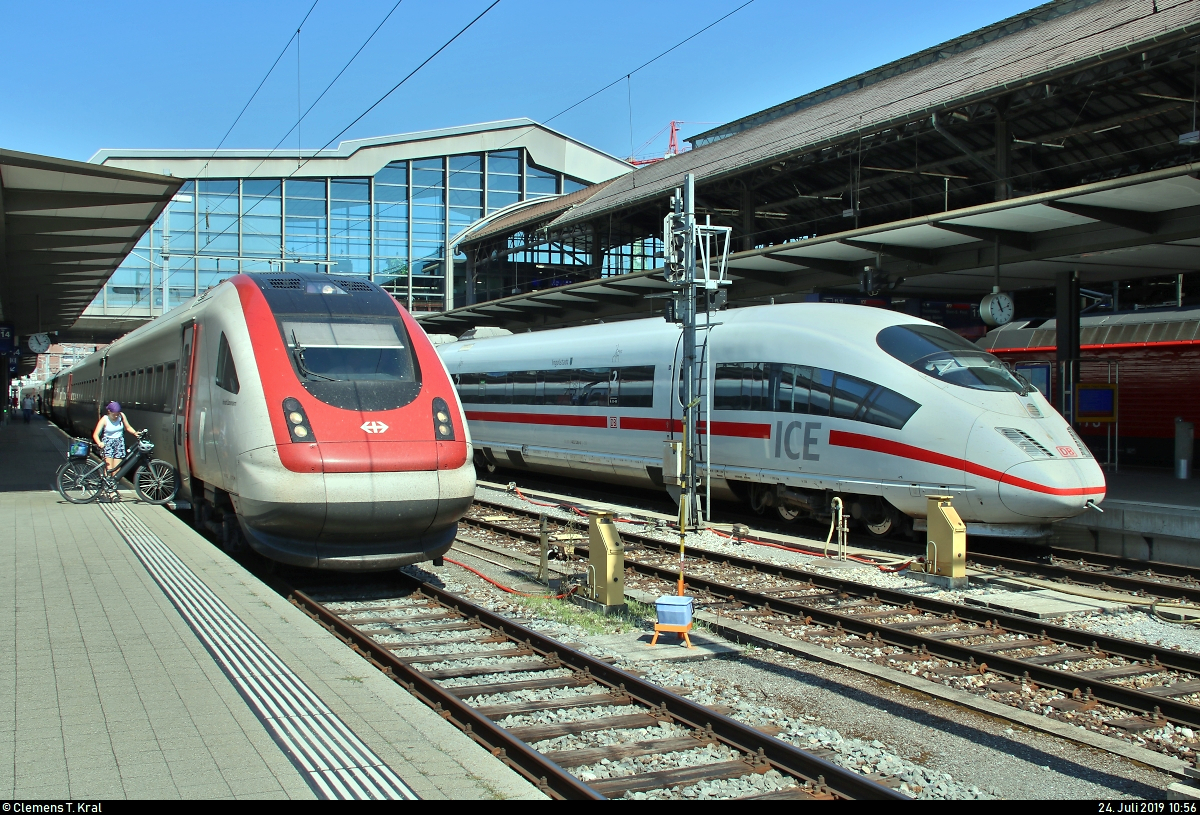 RABDe 500 043-8 "Harald Szeemann" als IC 1618 (IC 51) nach Biel/Bienne (CH) trifft auf 403 536-6 (Tz 336 "Ingolstadt") als ICE 108 (Linie 43) nach Köln Hbf (D) in ihrem Startbahnhof Basel SBB (CH).