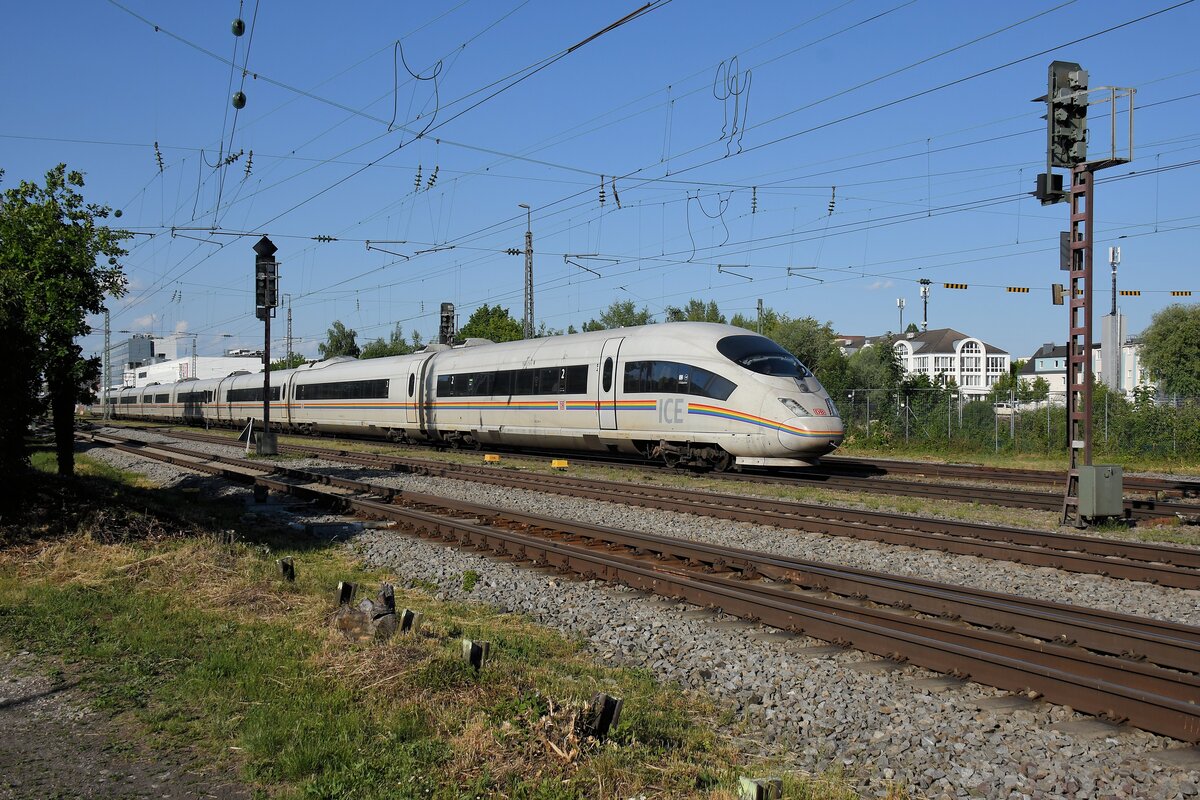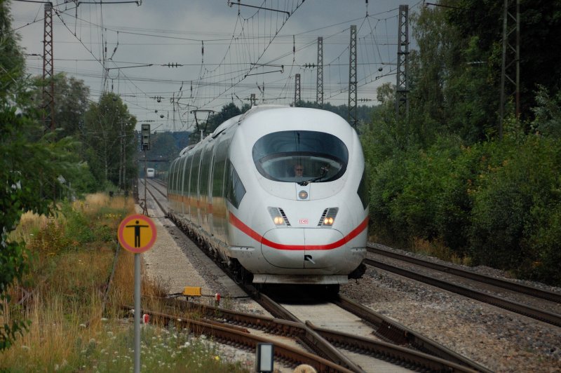 Einzelkind: Nicht ICE 518, sondern ICE 516 (München - Ulm), fährt doch!!! Einer von 6 !?! verbliebenen ICE 3 hält am Sonntag, 13.07.2008, wenn auch als Einzelzug, eine der vielen ICE 3-Linien aufrecht. Aufgenommen kurz vor Offingen/Donau an der KBS 980, Fahrtrichtung Ulm.