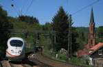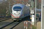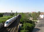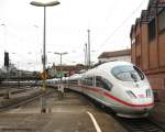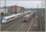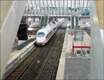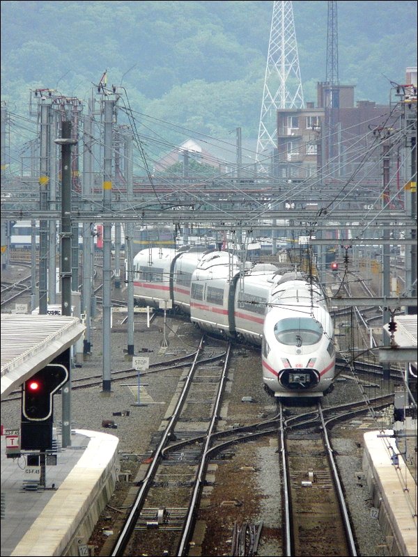 So sieht es von der Fußgängerbrücke im Bahnhof Liège Guillemins aus, wenn der ICE 3M 4604 sich in Richtung Köln im Bahnhofsvorfeld über die Weichen windet. 18.05.08
