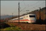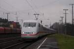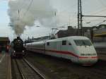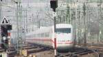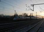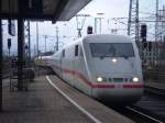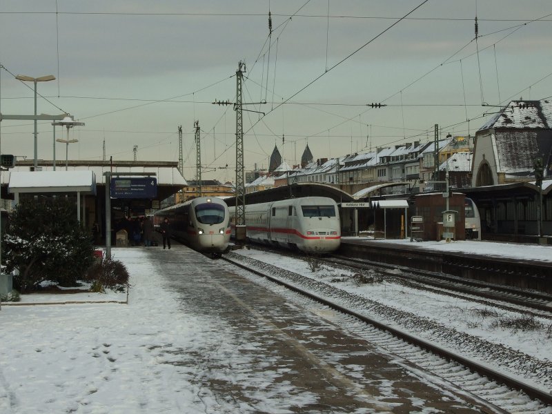 411 070-6 mit ICE27 nach Wien-West erreicht Koblenz Hauptbahnhof, während 401 557-4 mit ICE1026 nach Kiel den Bahnhof verlässt.Koblenz 6.1.09