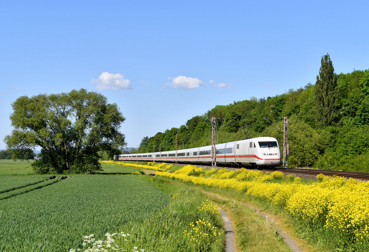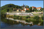 Am sonnigen 24.09.2011 passiert 415 024 "Hansestadt Rostock" die Dorfkirche von Rothenstein und spiegelt sich dabei im Wasser der Saale.