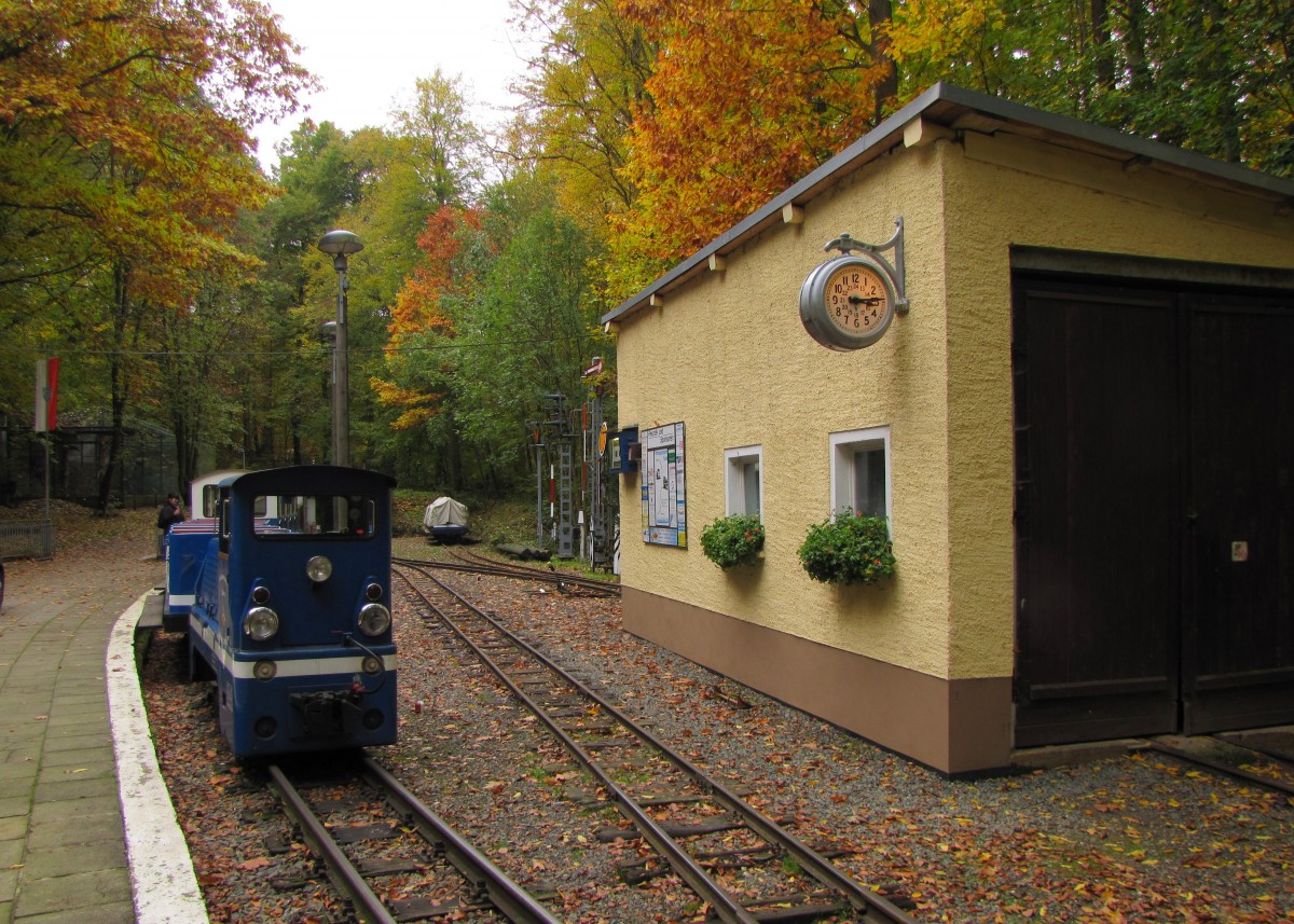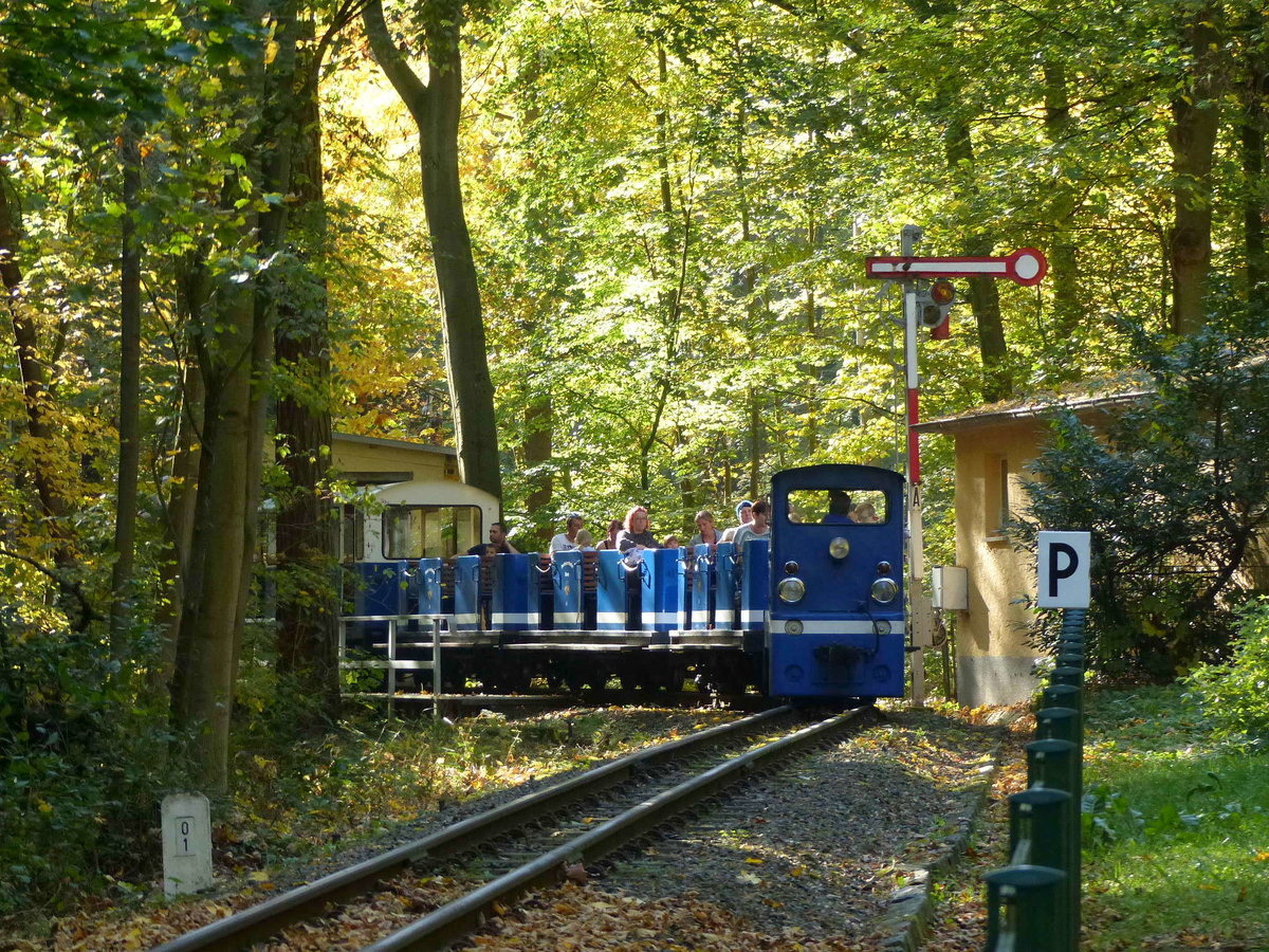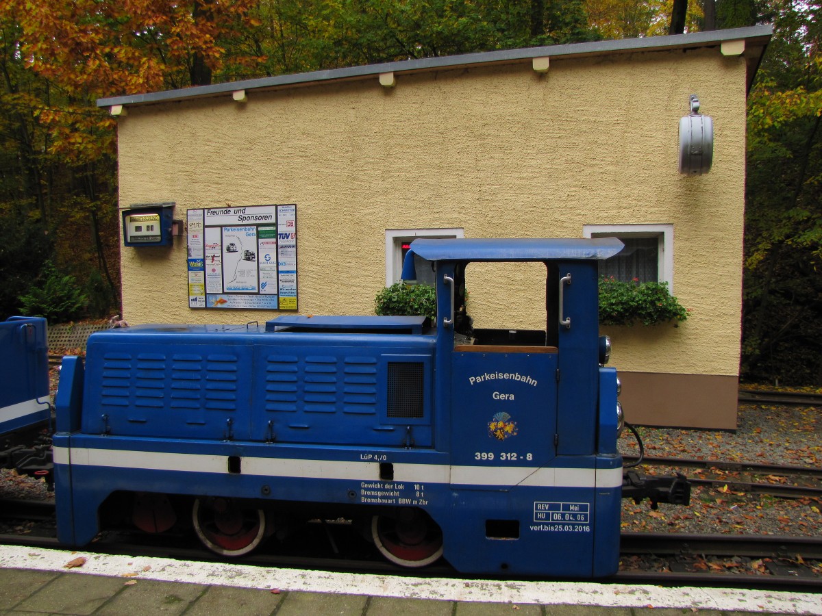 Parkeinsenbahn Gera 399 312-8 mit einem Zug aus dem Bahnhof Martinsgrund, am 22.10.2015 im Bahnhof Wolfsgehege.