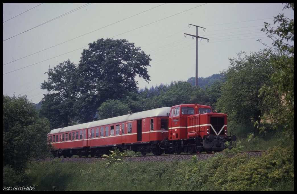 Zug 224 mit Lok VL 13 der Gelnhäuser Kreisbahn ist hier am 23.05.1990 von Wächtersbach nach Bad Orb unterwegs.