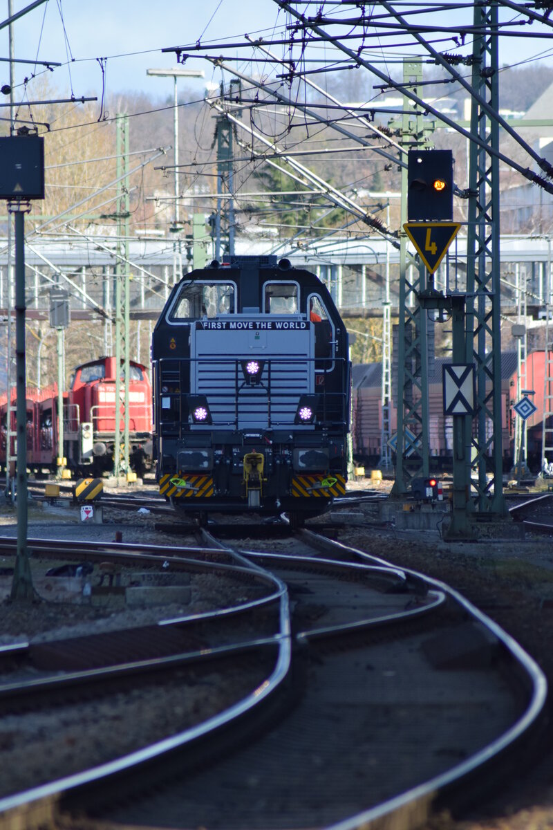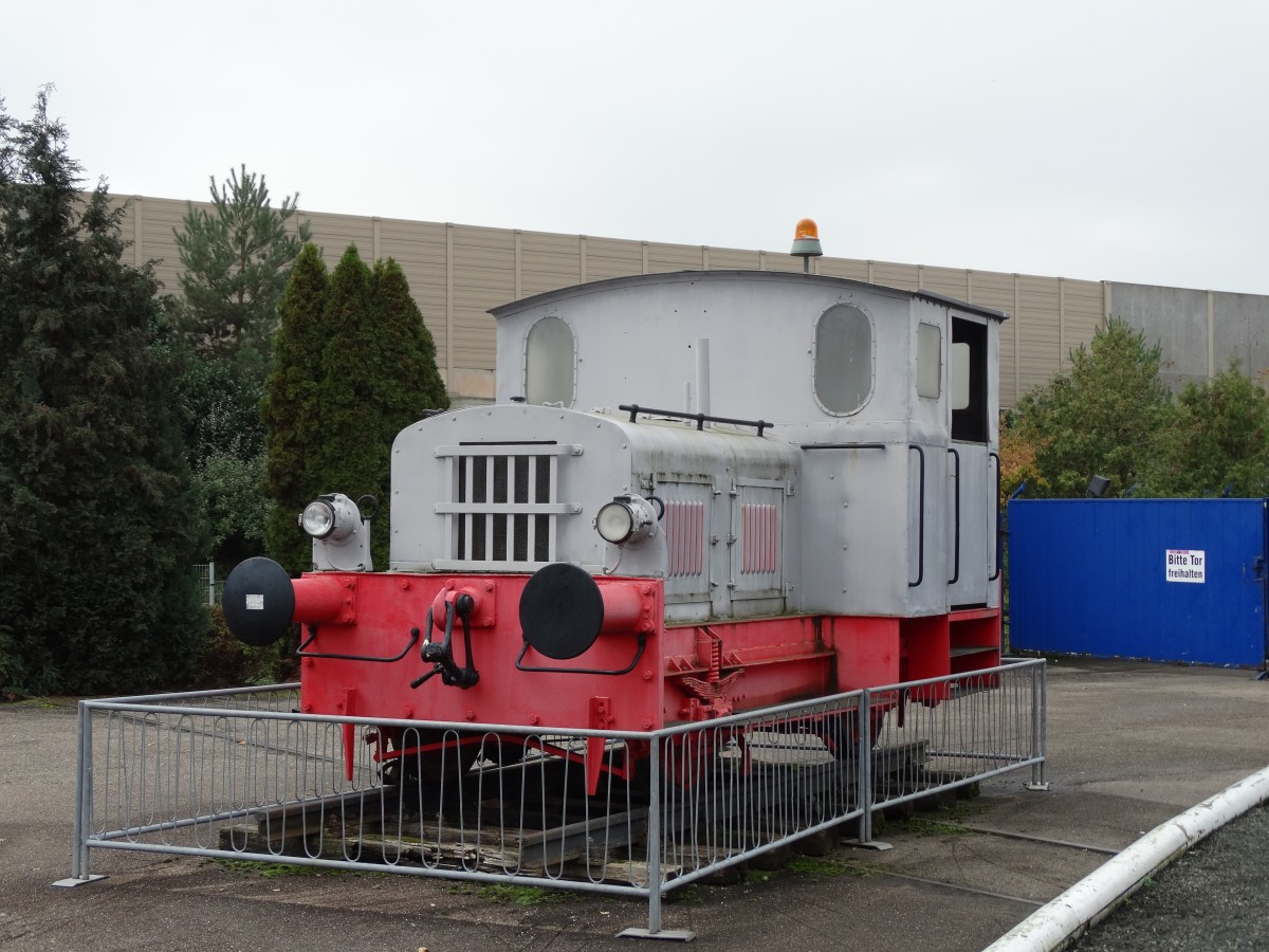 Rechts die 2-achsige Rangierlokomotive Gmeinder Typ 130 PS. Die Lok wurde 1963 von Gmeinder & Co. (Mosbach) unter der Fabriknummer 5254 gebaut und an die Rheinisch-Westfälische Kalkwerke, Werk Stromberg als RWK Nr. 1 geliefert, nach der Stilllegung des Kalkwerkes zum 01.07.2010 kam sie nach Steeden. Armin Schwarz
