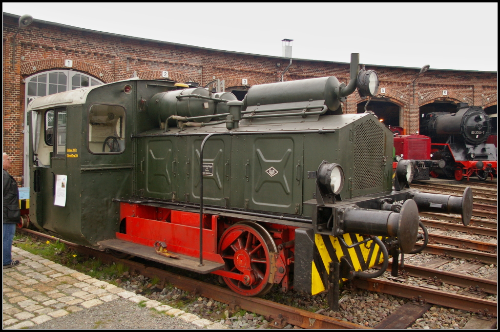 05.05.2013, Wittenberge, Historischer Lokschuppen. Eine O&K-Kleinlok, Typ RL 8 (Wehrmachtslok), Baujahr 1938, Werk Babelsberg. Nach dem Krieg kam sie zur OHE (Köf 0603) und gehörte ab 2001 nach Salzwedel (privat). Die Lok wird heute noch zum Rangieren genutzt.