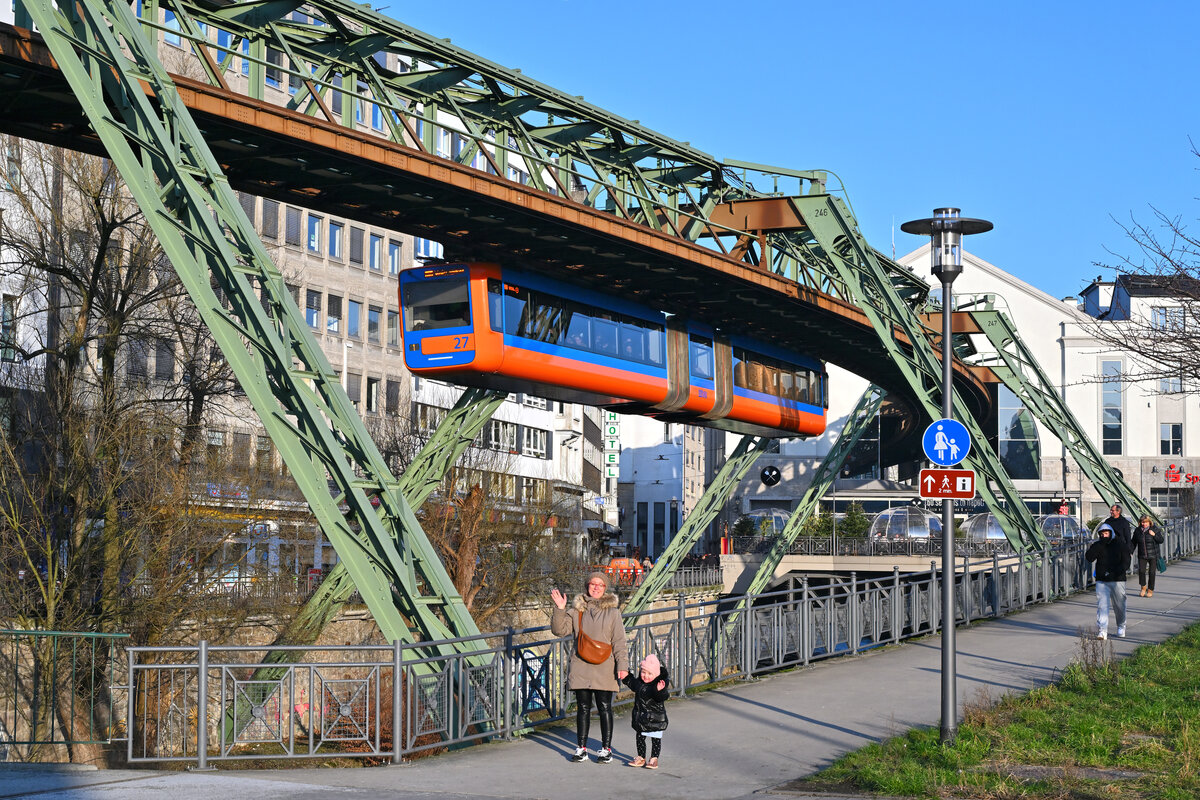 Ein Schwebebahnzug in Fahrtrichtung Wuppertal-Vohwinkel kurz vor der Haltestelle Zoo / Stadion.