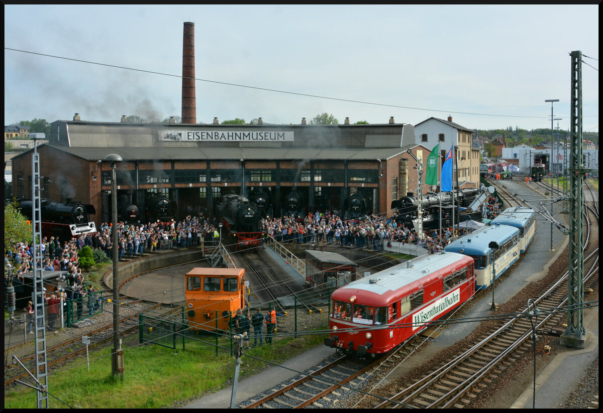16. Dresdner Dampfloktreffen 2024: Der altbekannte Blick von der Nossener Brücke auf das Eisenbahnmuseum in Dresden-Altstadt. Die Schienenbusse der Wisentatalbahn (VT 789 813-1, 592-1 und VS 998 663-1) pendelten zwischen BW und Hauptbahnhof. 13.04.2024 Matthias Kümmel