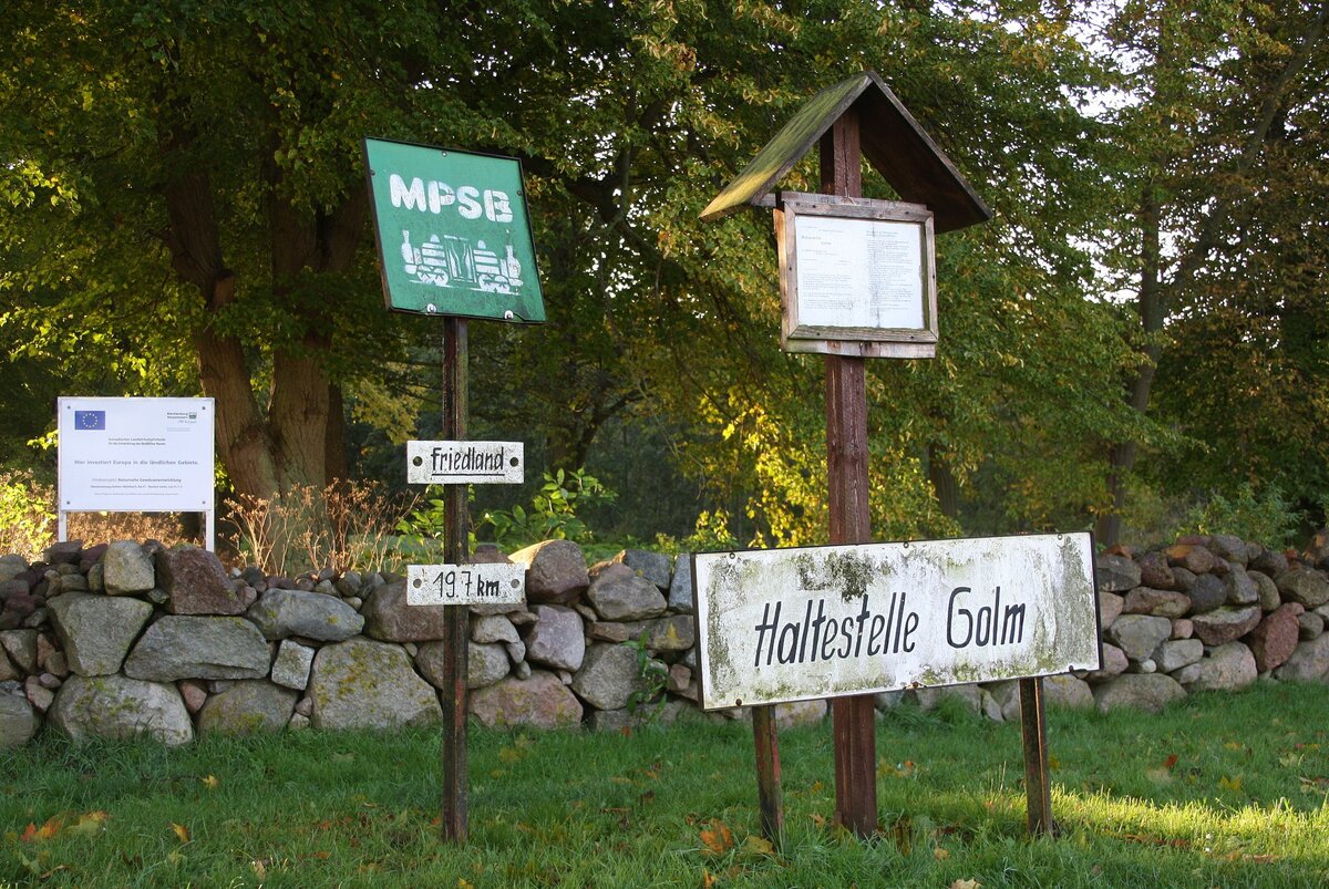 Die kleine Köf 0413 der MPSB bei Haltestelle Findlingsgarten bei Friedland am Ostermontag den 10.4.2023. Die Schmalspurbahn hatte über Ostern ein kleines Fest veranstaltet und dabei mehrere Fahrten von Schwichtenberg auf der alten Schmalspurbahnstrecke zum nahegelegenen Findlingsgarten mit der Köf unternommen.