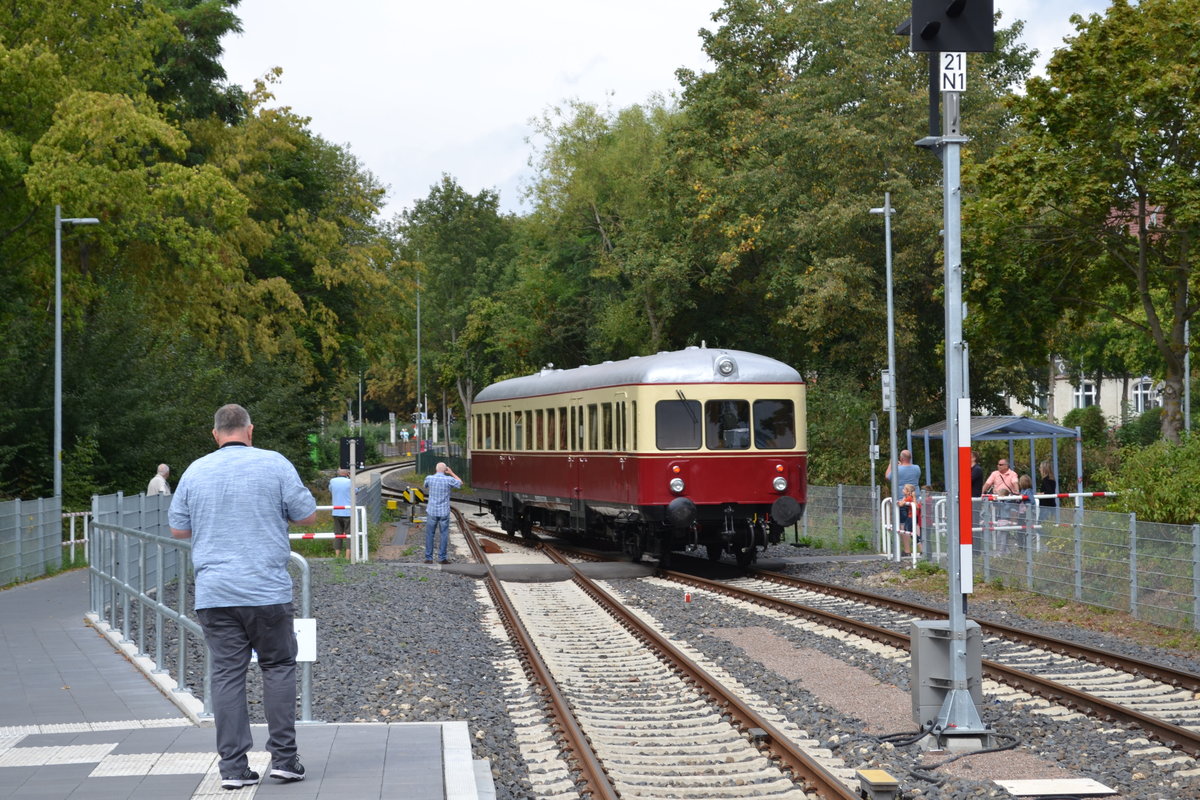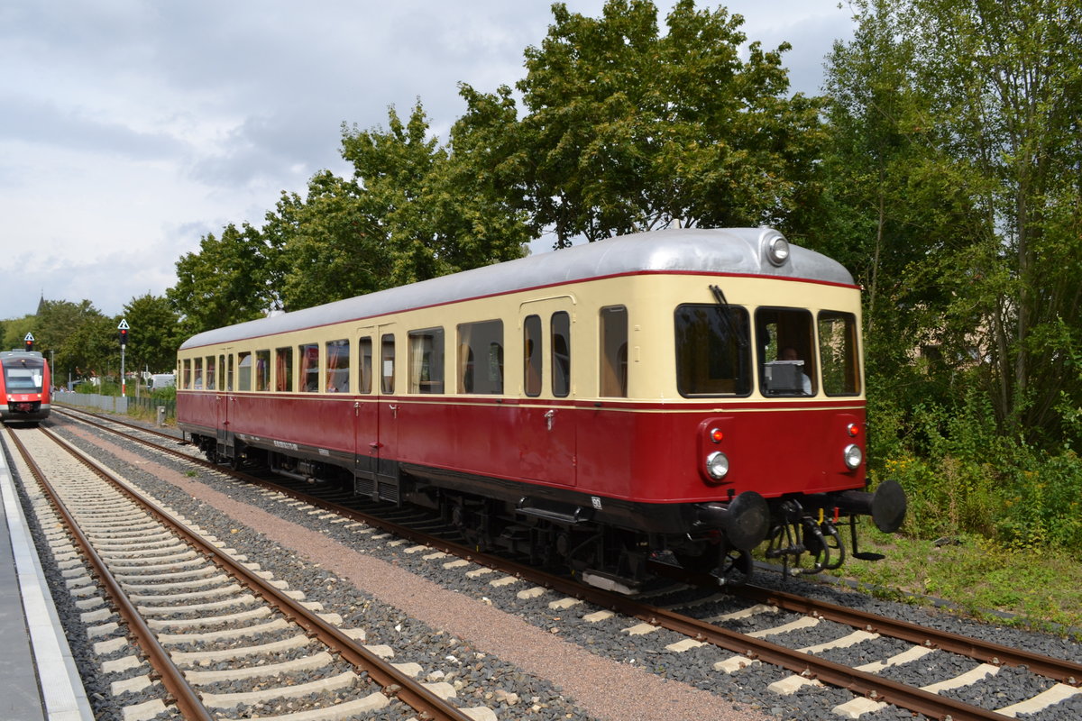 Am 01.09.2019 fuhr ein sogenannter Esslinger Triebwagen T 62 des Vereins Braunschweiger Verkehrsfreunde nach Einbeck und dort zum Haltepunkt am PS.Speicher. Leider ließ sich nicht die Sonne blicken, kein optiomales Photowetter.