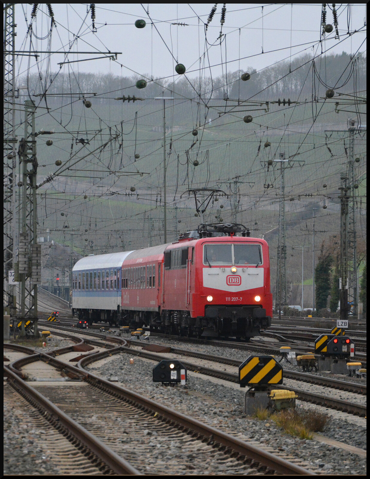 Die GfF-Elektrolokomotive 111 200 schiebt einen zusätzlichen RB48-Ersatzzug, hier zu sehen im April 2021 bei der Durchfahrt in Wuppertal-Unterbarmen.
