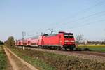 Mit einem RE (Freiburg (Brsg) Hbf - Basel Bad Bf) fuhr am späten Nachmittag des 21.04.2020 die 146 236-5 "Schwarzwaldbahn Erlebnispfard/Triberg" südlich von Buggingen über die Rheintalbahn in Richtung Müllheim (Baden).