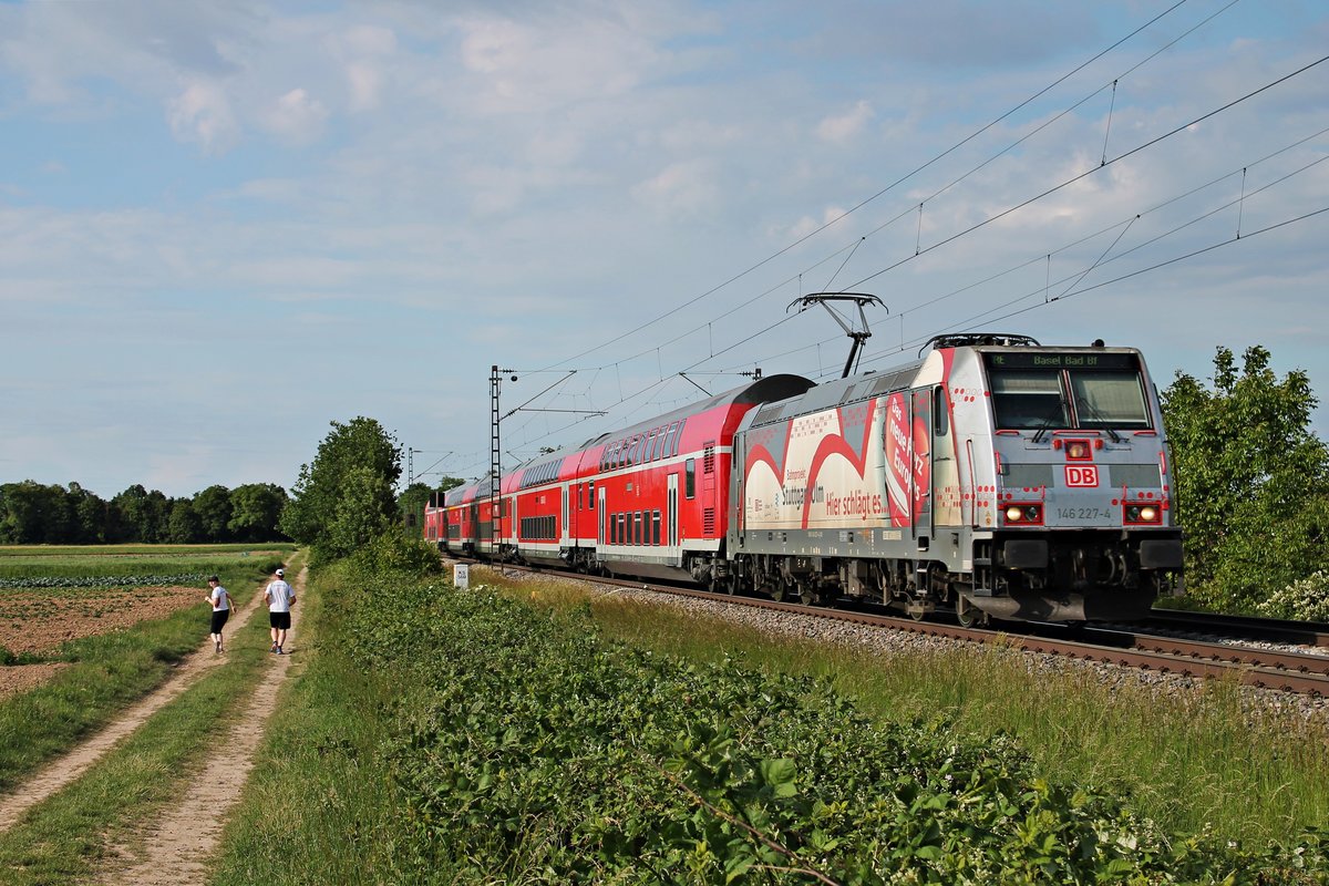 Mit ihrem RE (Freiburg (Brsg) Hbf - Basel Bad Bf) fuhr am frühen Abend des 19.05.2020 die Freiburger 146 227-4 "Bahnprojekt Stuttgart-Ulm" bei Buggingen über die KBS 702 durchs Rheintal in Richtung Schweiz.
