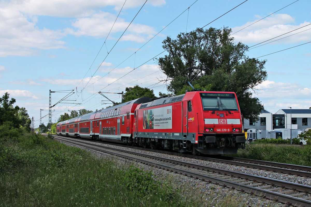 Nachschuss auf die Freiburger 146 220-9 "Kein Job wie jeder andere: Triebfahrzeugführer (w/m) bei der DB", als diese am Nachmittag des 29.05.2020 ihren RE (Basel Bad Bf - Freiburg (Brsg) Hbf) durchs Industriegebiet von Buggingen in Richtung Heitersheim schob.