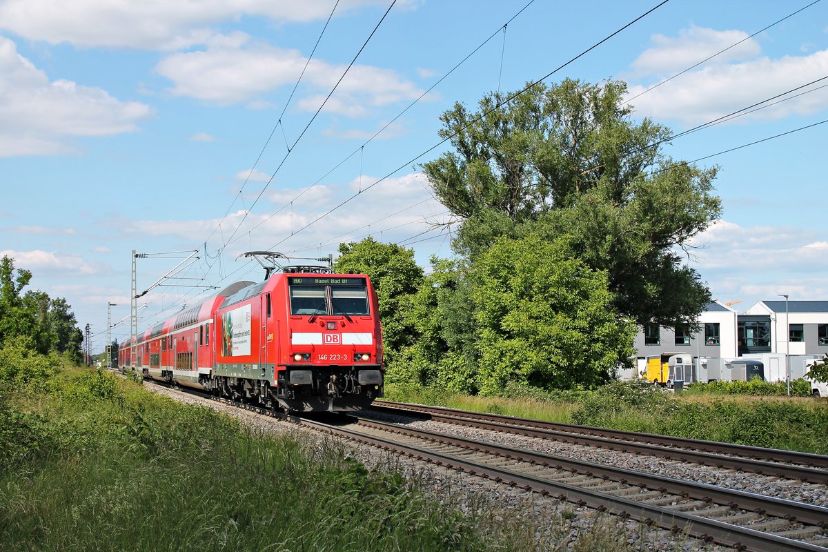 Am Nachmittag des 29.05.2020 fuhr 146 223-3 "Kein Job wie jeder andere: Triebfahrzeugführer (w/m) bei der DB)" mit ihrem RE (Freiburg (Brsg) Hbf - Basel Bad Bf) durchs Industriegebiet von Buggingen in Richtung Müllheim (Baden).