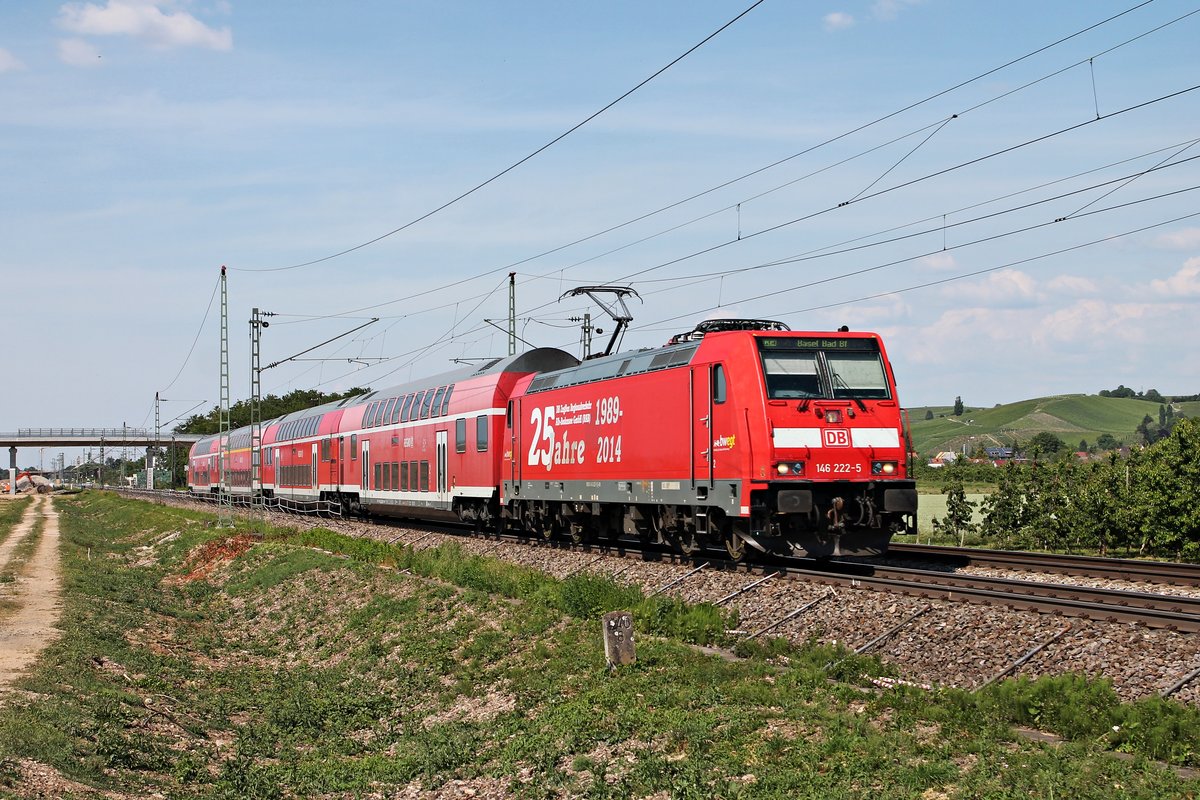 Als RE (Freiburg (Brsg) Hbf - Basel Bad Bf) fuhr am späten Nachmittag des 02.06.2020 die 146 222-5 "25 Jahre RAB" südlich vom Haltepunkt von Auggen über die KBS 702 in Richtung Schliengen, wo sie ihren nächsten Zwischenhalt einlegen wird.