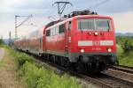Mit einer RB (Offenburg - Basel Bad Bf) fuhr am 10.07.2015 die Freiburger 111 064 bei Hügelheim ihrem nächsten Zwischenhalt in Müllheim (baden) entgegen.