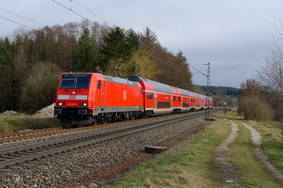 146 245 mit dem RE 4858 (München Hbf - Nürnberg Hbf) bei Postbauer-Heng, 02.03.2020