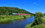 Ein motivischer Notbehelf am Ufer der Naab. Am 05. September 2024 statte ich der KBS 855 einen Besuch ab und widmete mich der Streckenkunde aus Fotografen-Sicht. Bei Nabburg gibt es einige Möglichkeiten. Allerdings musste ich feststellen, dass die bekannten Stellen am Ufer der Naab ziemlich zugewachsen waren. Während des feuchten Sommers war das Strauchwerk in die Höhe geschossen. Letztlich fand ich die hier gezeigte Stelle als Kompromisslösung. Die frisch aufpolierte 218 438 mit dem RE 4861 von Hof nach München HBF war mir natürlich ein Bild wert.
