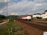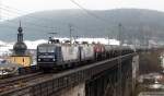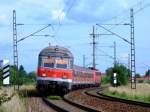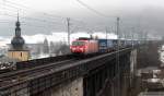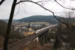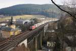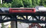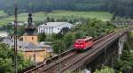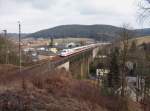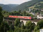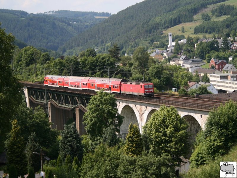 143 859-7 überquert die Trogenbachbrücke in Ludwigsstadt (Landkreis Kronach) mit einer Regionalbahn, gebildet aus drei Doppelstockwagen. Die Aufnahme entstand am 18. Juni 2008.