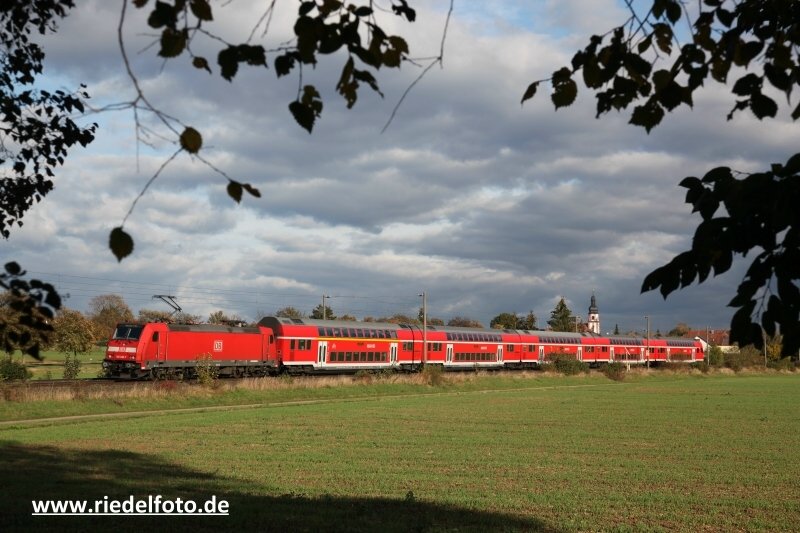 Kurz nach Sonnenuntergang durchquert ein Twindexx mit dem RE 4625 (Frankfurt (Main) Hbf - Bamberg) bei Gambach das Maintal, 07.10.2021