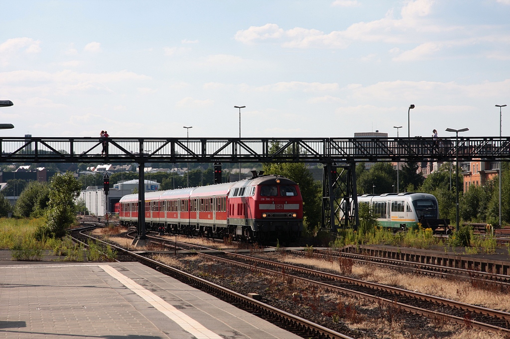 218 390 + RE3715 bei Einfahrt Hof Hbf am 19.07.2010. Die teilweise mit abgebildete Luftbrücke überspannt die gesamte Breite dieses Bahnhofes. Ob sie die Arbeiten zur Elektrifizierung des Streckenabschnittes Reichenbach - Hof überstehen wird?
