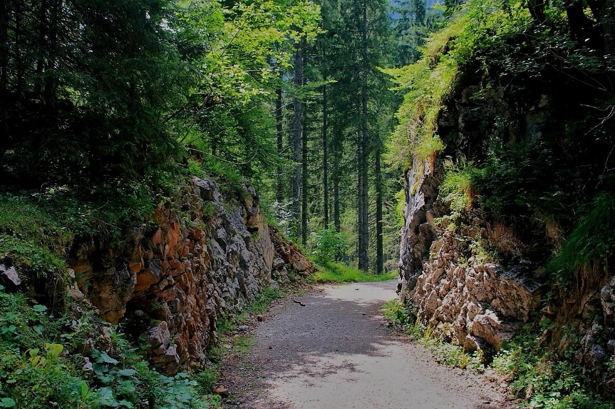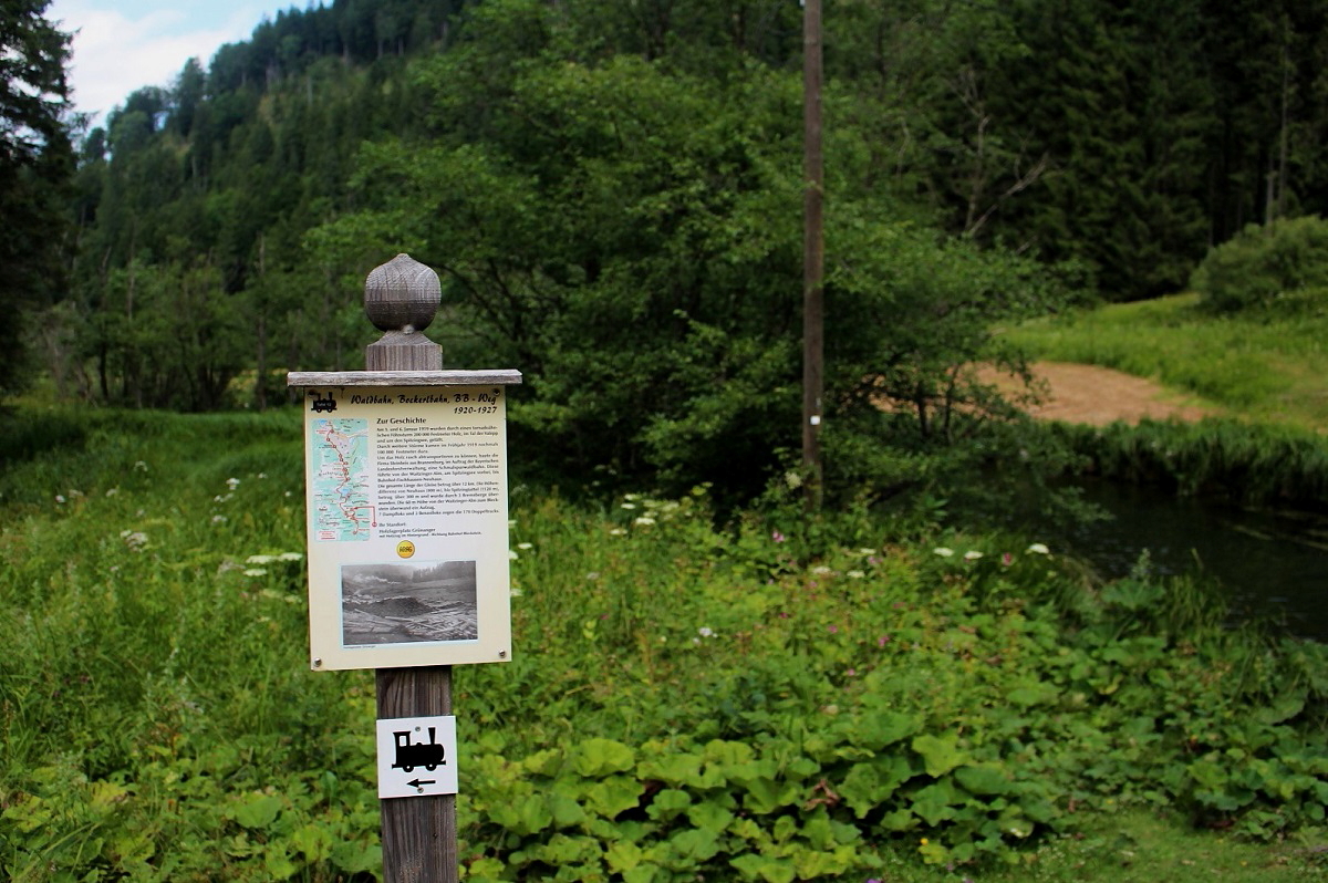 Zwischen 1920 und 1927 existierte eine 600 mm-Waldbahn, die vom Bahnhof Fischhausen-Neuhaus an der heutigen KBS 955 zum über 300 m höher gelegenen Spitzingsee und von dort weiter hinab in die Valepp führte. Die mit 3 Bremsbergen und einem dampfbetriebenen Aufzug aufwendig trassierte 12 km lange Bahn wurde zum Abtransport vom 290.000 cbm Festholz angelegt, die nach Föhnstürmen 1919/1920 niedergewalzt worden waren. Dafür standen 7 Dampf- und 2 Benzollokomotiven zur Verfügung. Auf der Trasse wurde vor wenigen Jahren vom "Freundeskreis der Neuhauser Bockerlbahn" ein Wanderweg angelegt, der mit 20 Hinweistafeln beschildert ist. Im Bild vom 12.08.2013 der Blecksteindurchbruch und links eine Hinweistafel.