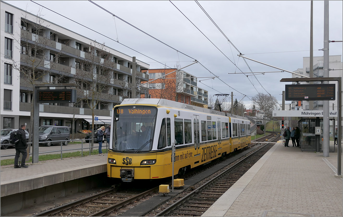 Am Mittag des 15.8.2020 verlässt das Gespann bestehend aus den Wagen 3559/3560 und 3505/3506 als Linie U7 nach Ostfildern Nellingen die Haltestelle Zinsholz.