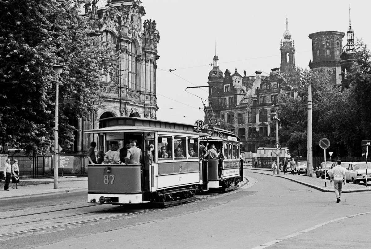 26. August 1984, Dresden, ein Sonderzug der Straßenbahn mit Tw 937 (Dresdner Eigenbau 1927) und Bw 307 (Dresdner Eigenbau 1912), beide seit 1972 im Bestand der historischen Fahrzeuge, kommt auf seiner Fahrt vom Haptbahnhof nach Radebeul am Zwinger vorüber. Jürgen Krause