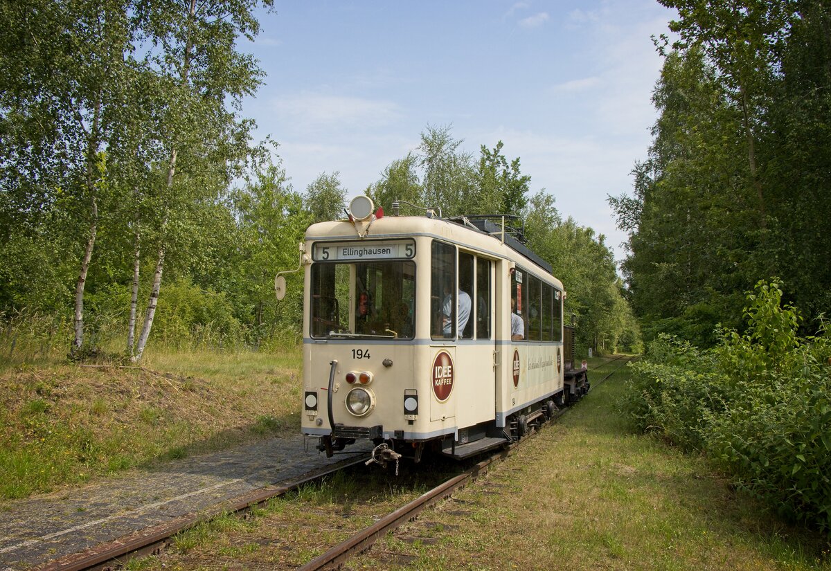 Während der 10. Netter Klassiker-Tage stehen die Triebwagen 194 und 431 mit ihren Dieselaggregaten bereit für Pendelfahrten über die Vereinsstrecke im Dortmunder Nordwesten (31.07.2021)