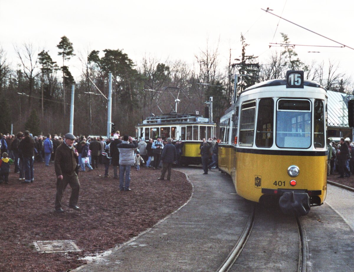 SSB Stuttgart__Letztmalig Linie 15 im Linienverkehr unterm Fernsehturm (dem ersten der Welt von 1956) in der Endschleife 'Ruhbank/Fernsehturm'. GT4 416 verabschiedet sich mit "Bis dann!"__08-12-2007