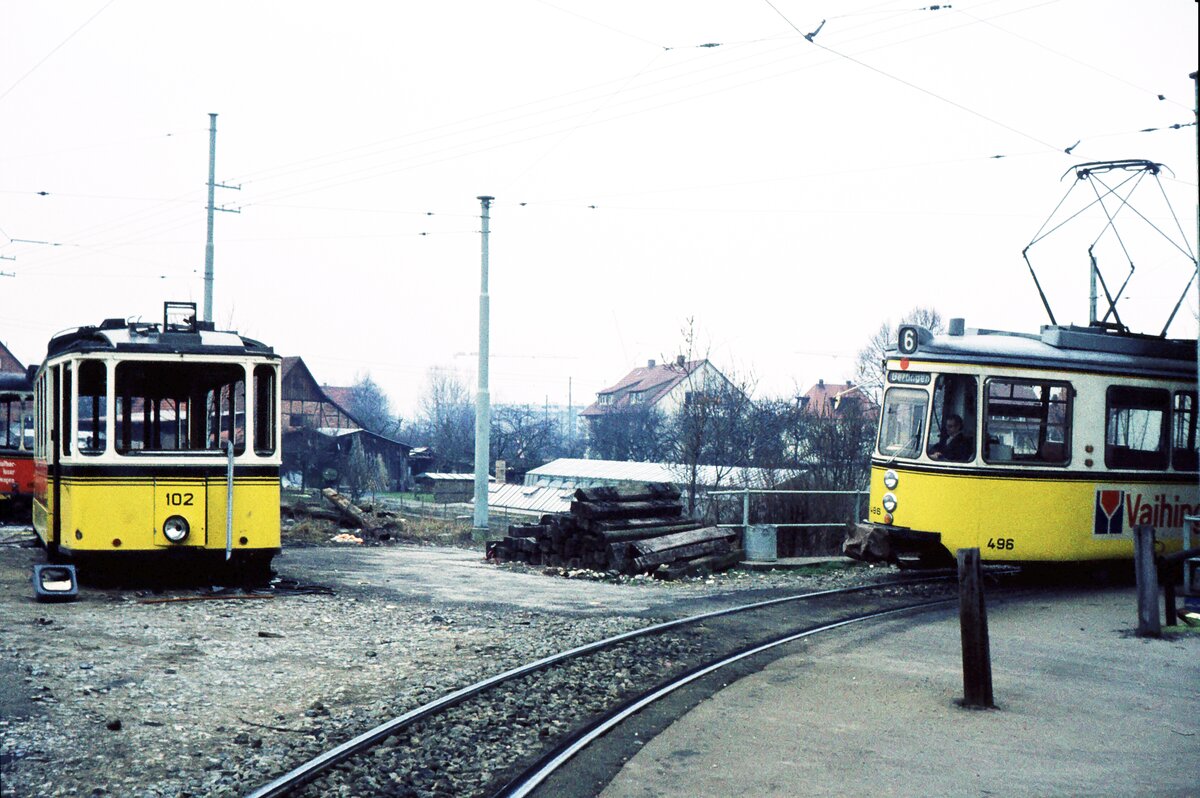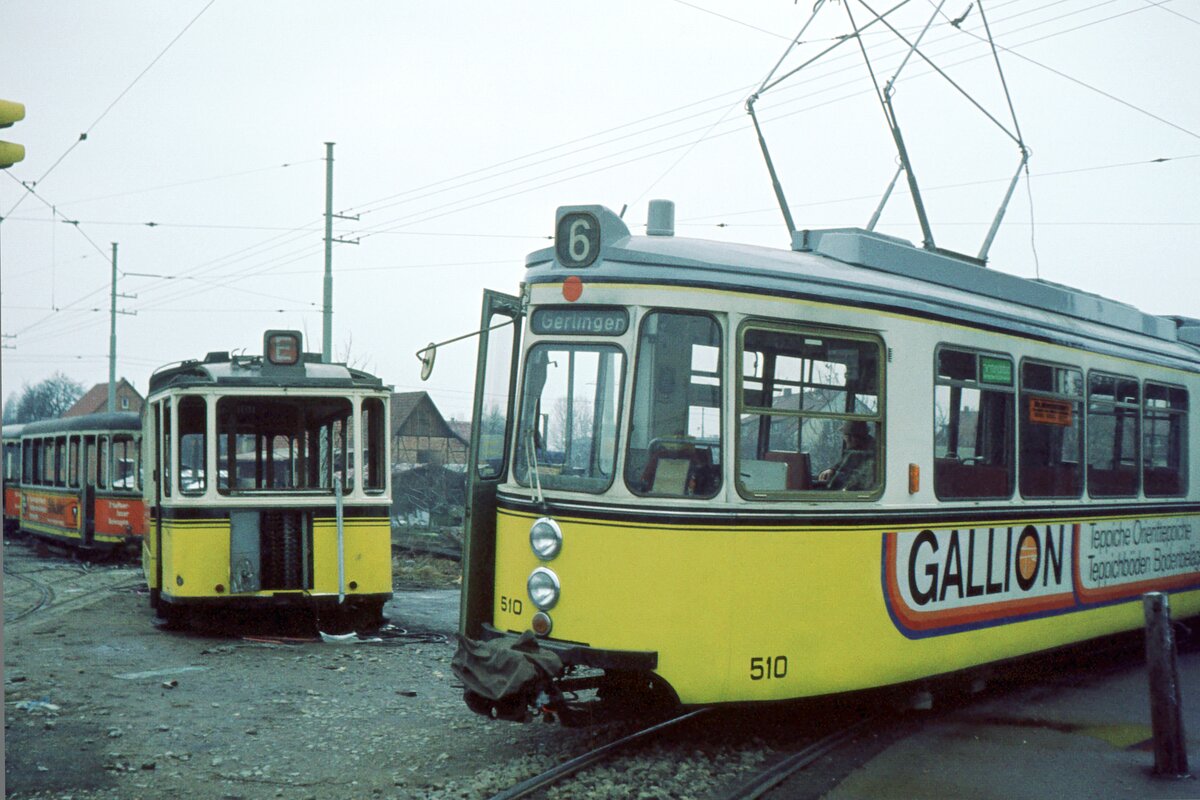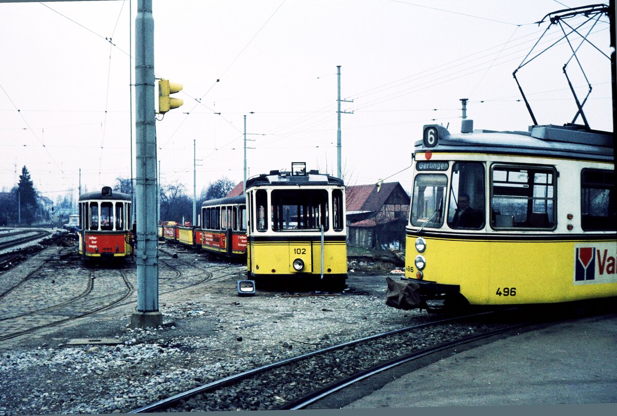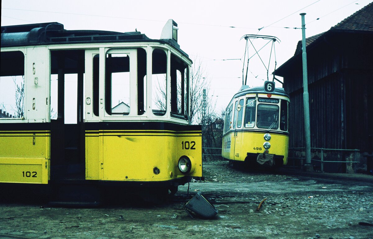 Straßenbahn Neunkirchen/Saar__Der zum Schluß bis zur Einstellung am 10.Juni 1978 ziemlich geschrumpfte Straßenbahnbetrieb war vor allem für seinen Steilstreckenabschnitt (11 %) in der Hüttenbergstraße und für die einzigen normalspurigen GT4 bekannt. Im Bild ebendort Linie 2 am Hüttenberg.__26-09-1977