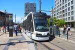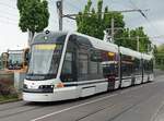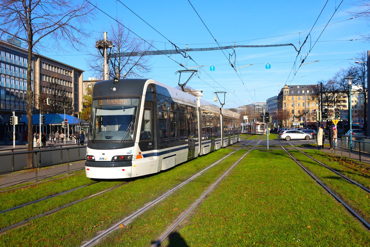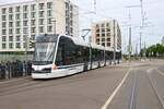 Hier steht Skoda ForCity Smart 1404 der Linie 3 zur Rheingoldhalle am Steig C. Der Steig D befindet sich links daneben.