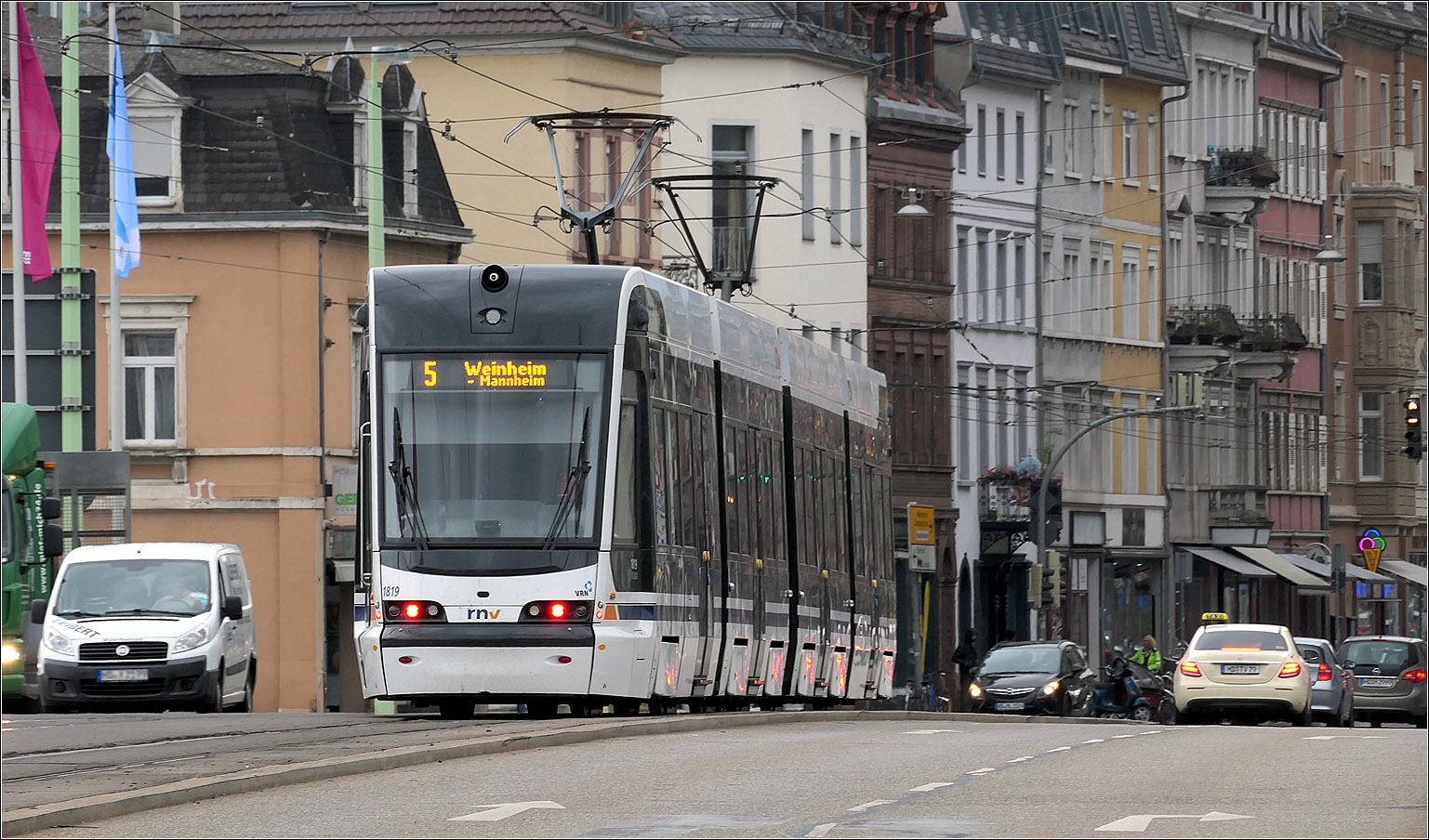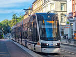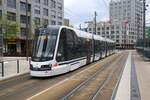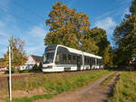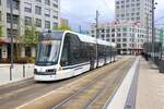 ... biegt Skoda ForCity Smart 1405 + zweiter Wagen auf dem Willy-Brandt-Platz in die Kaiserstraße ab.