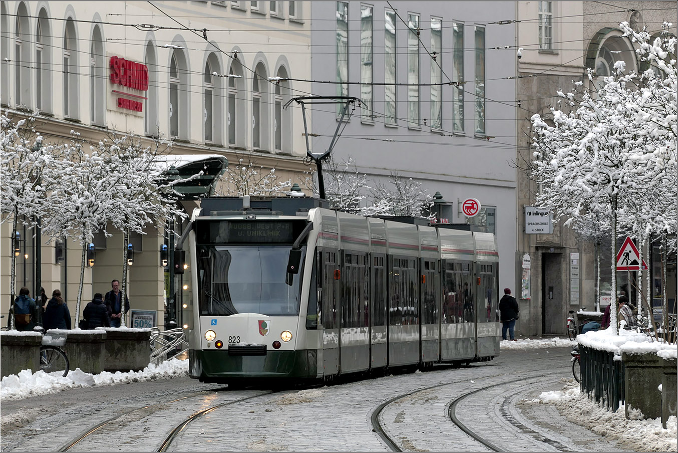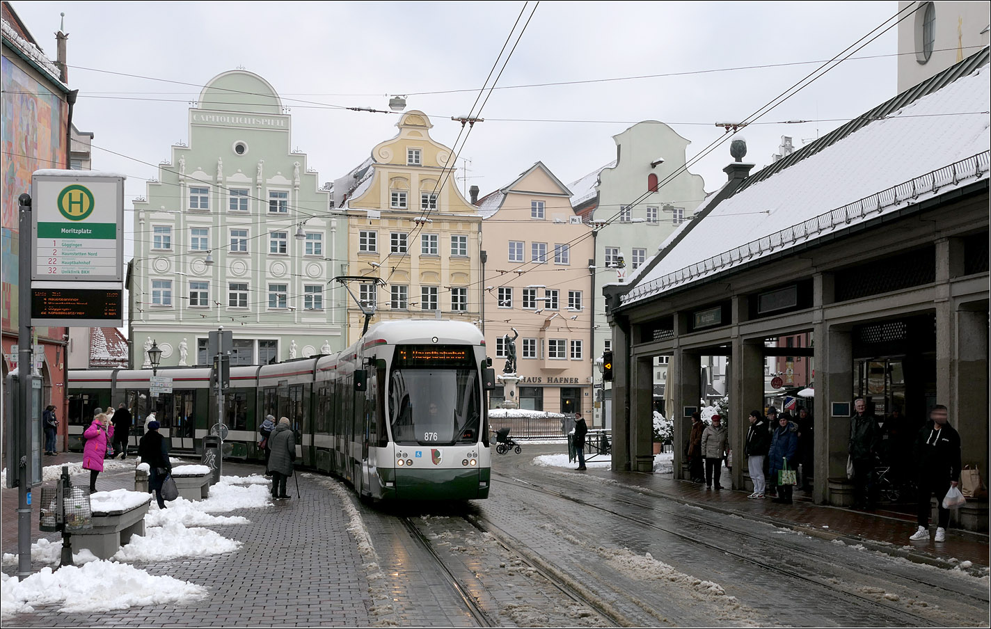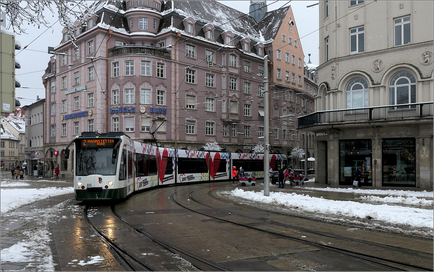 GT5 527 Anfang April 1988 als Linie 2 auf dem Weg nach Kriegshaber in der Augsburger Innenstadt