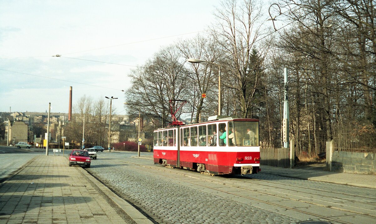Straßenbahn Plauen__Tw 212 [KT4DM, CKD 1983;+ 2005] auf Linie 5 Richtung Innenstadt bei der Haltestelle Bickelstraße.__03-02-1990