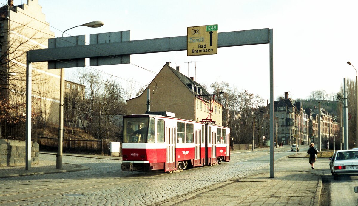 Straßenbahn Plauen__Mit wehenden Fahnen wurden wir Bundesbürger 3 Monate nach dem Mauerfall in Plauen begrüßt. Tw 212 [KT4DM, CKD 1983;+ 2005] auf Linie 5 von der Südvorstadt kommend bei der Haltestelle Bickelstraße.__03-02-1990 Klaus-Erich Lisk