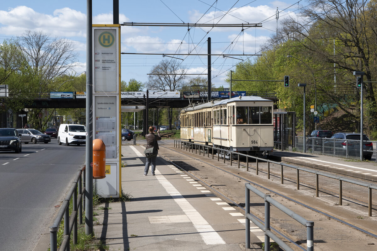 Am 26.04.2026 unternahm man vom Bahnhof Schönweide in Berlin, bis nach S Friedrichshagen & zurück eine 80 Minütige Sonderfahrt mit dem T24/49 + B24 + B06/27. Thema war auf den Spuren der Berufsverkehrslinie 25E. Die Frau war sichtlich begeistert und machte auch ein Bild zur Erinnerung.